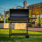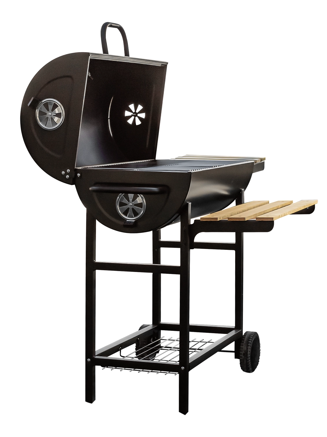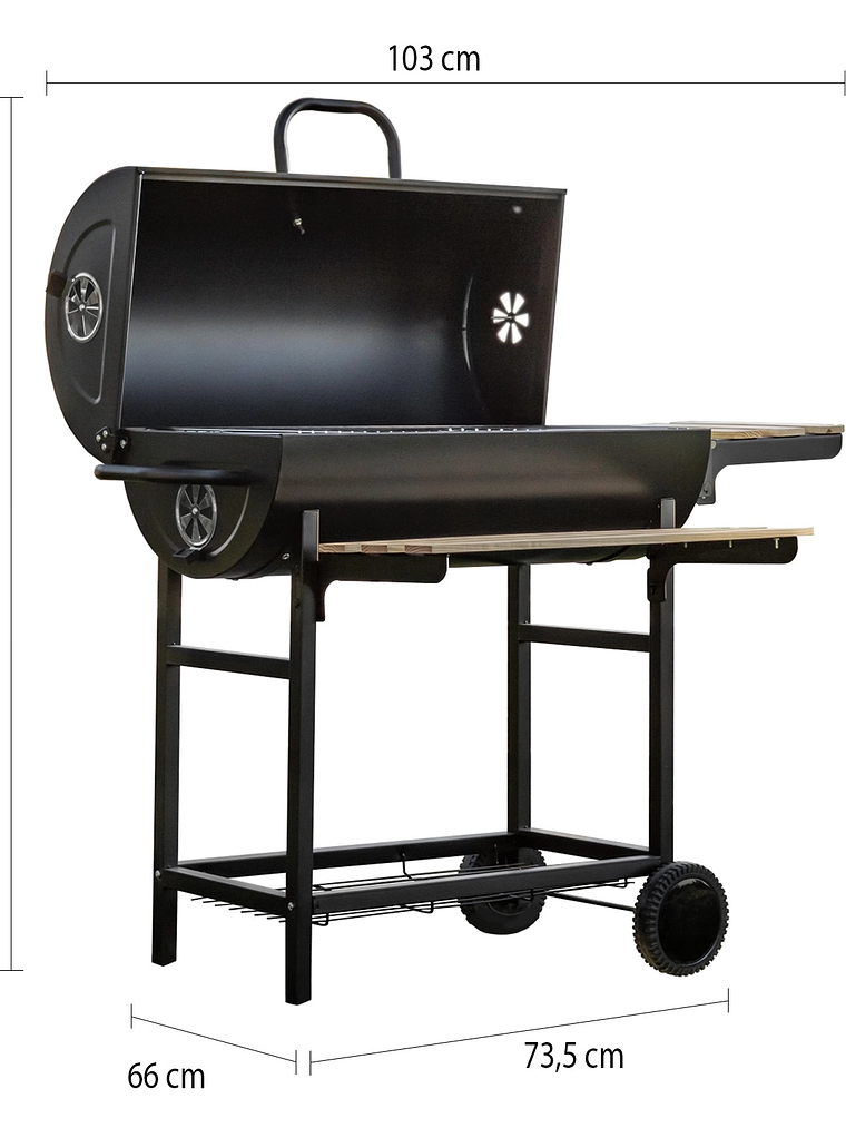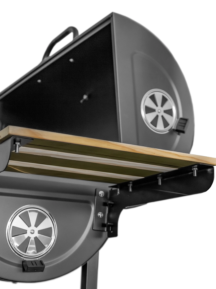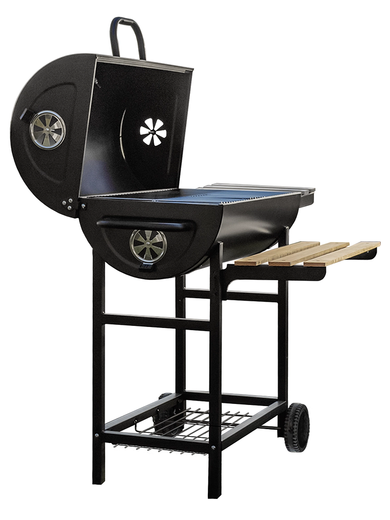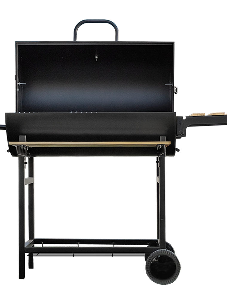Incluye bandejas plegables frontal y lateral, perfectas para apoyar utensilios o ingredientes, además de una rejilla inferior multipropósito que entrega organización adicional. Su estructura de acero con tapa resistente garantiza durabilidad, mientras que el termómetro incorporado y el regulador de flujo de aire te permiten tener un control preciso del calor durante todo el proceso.