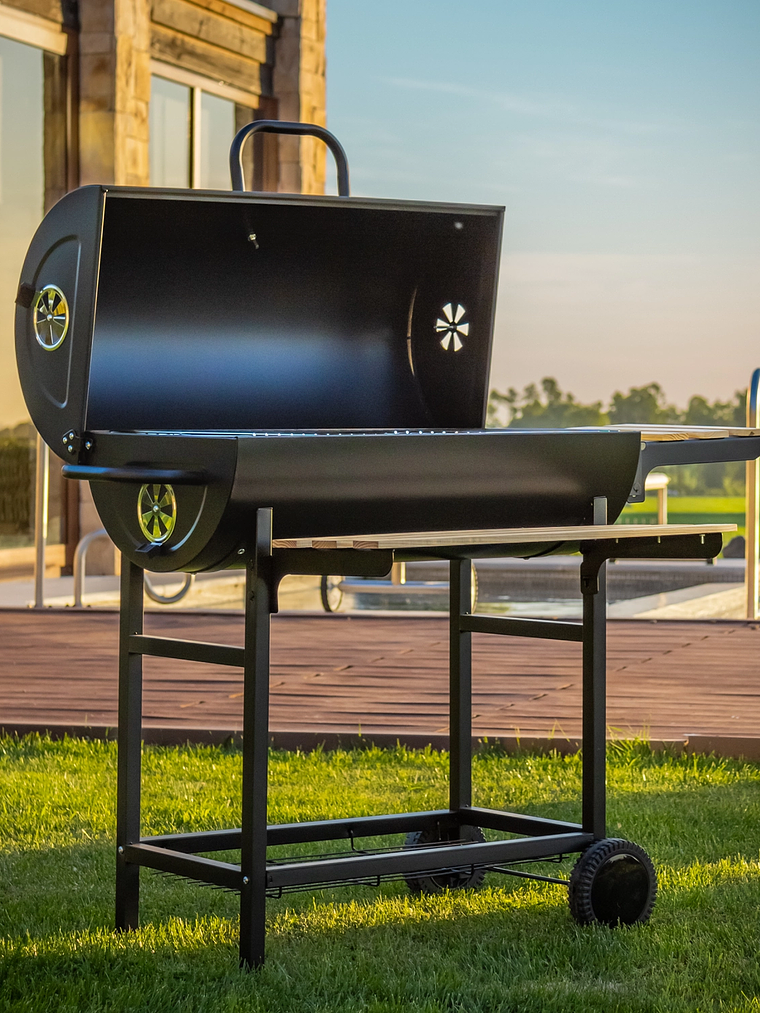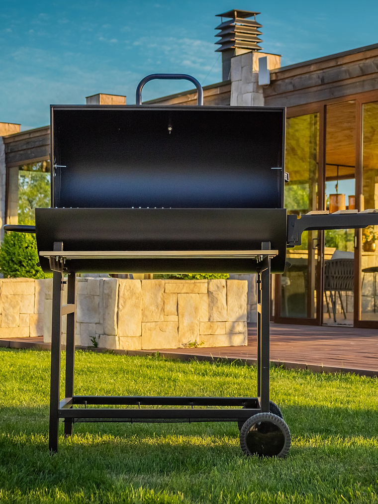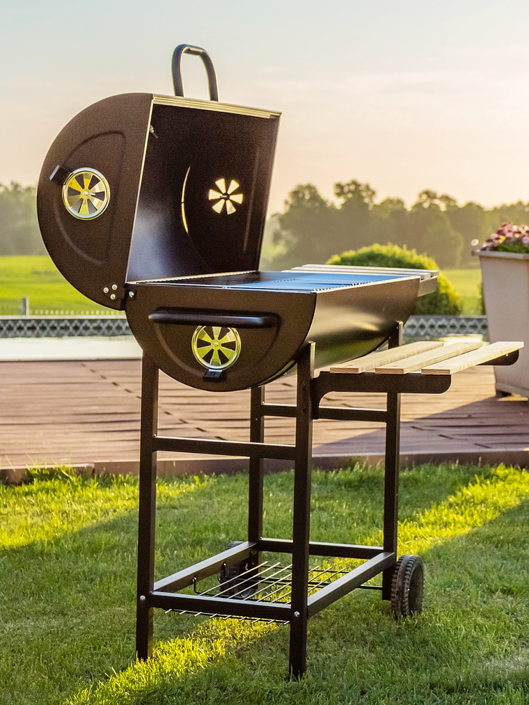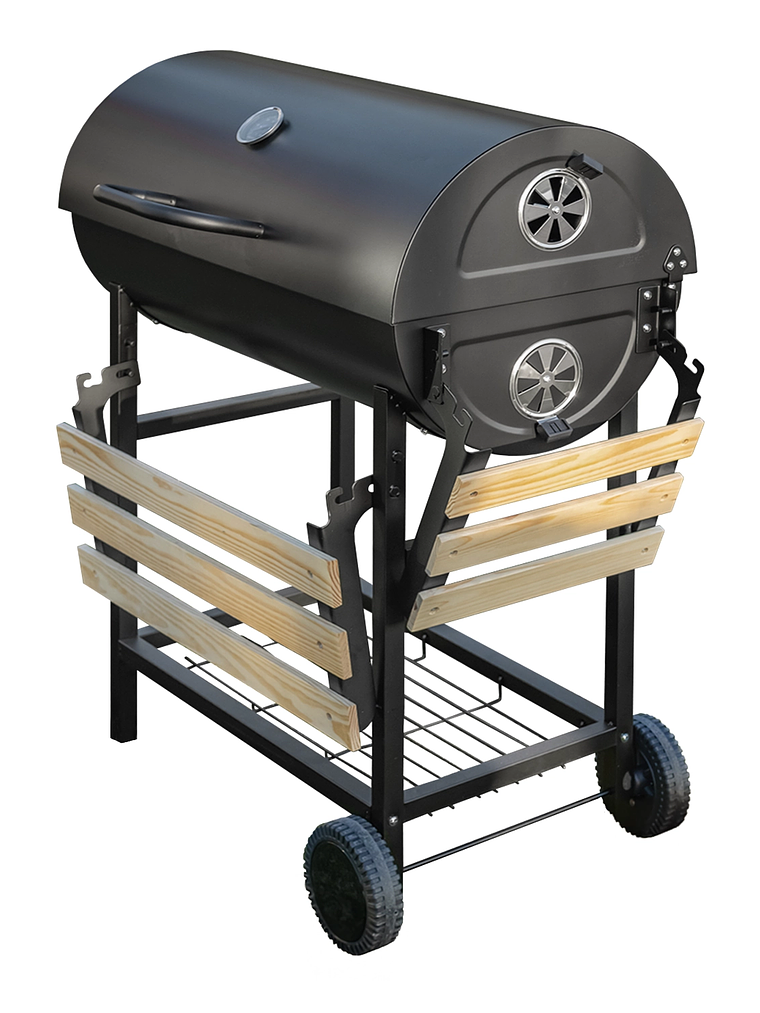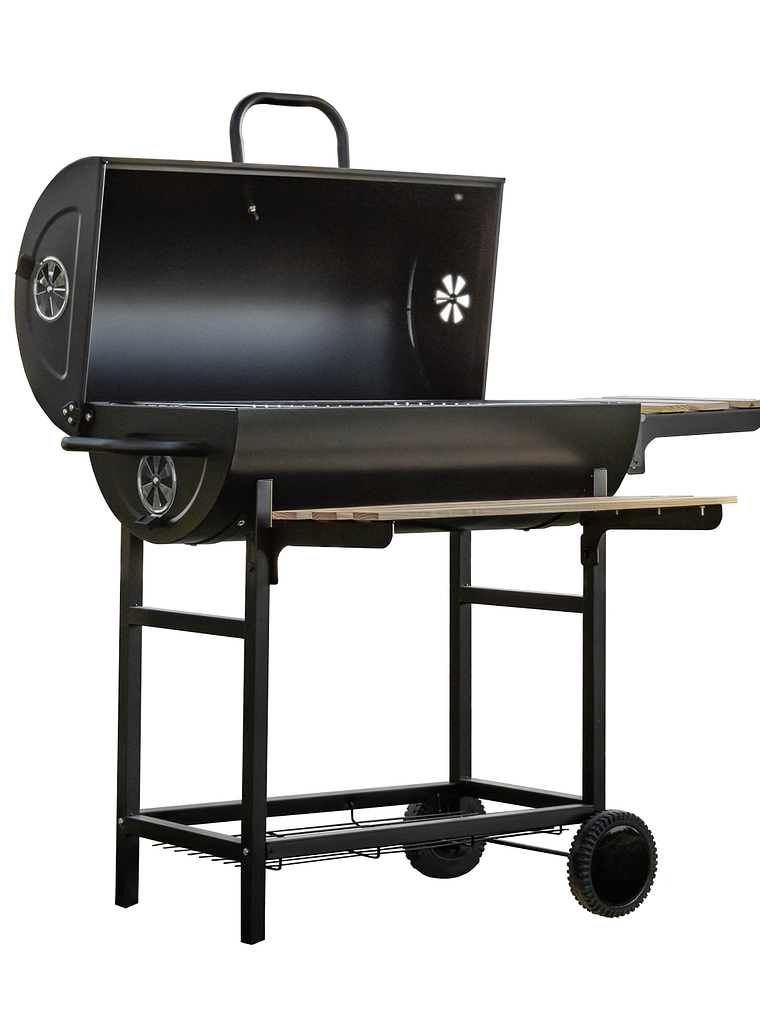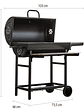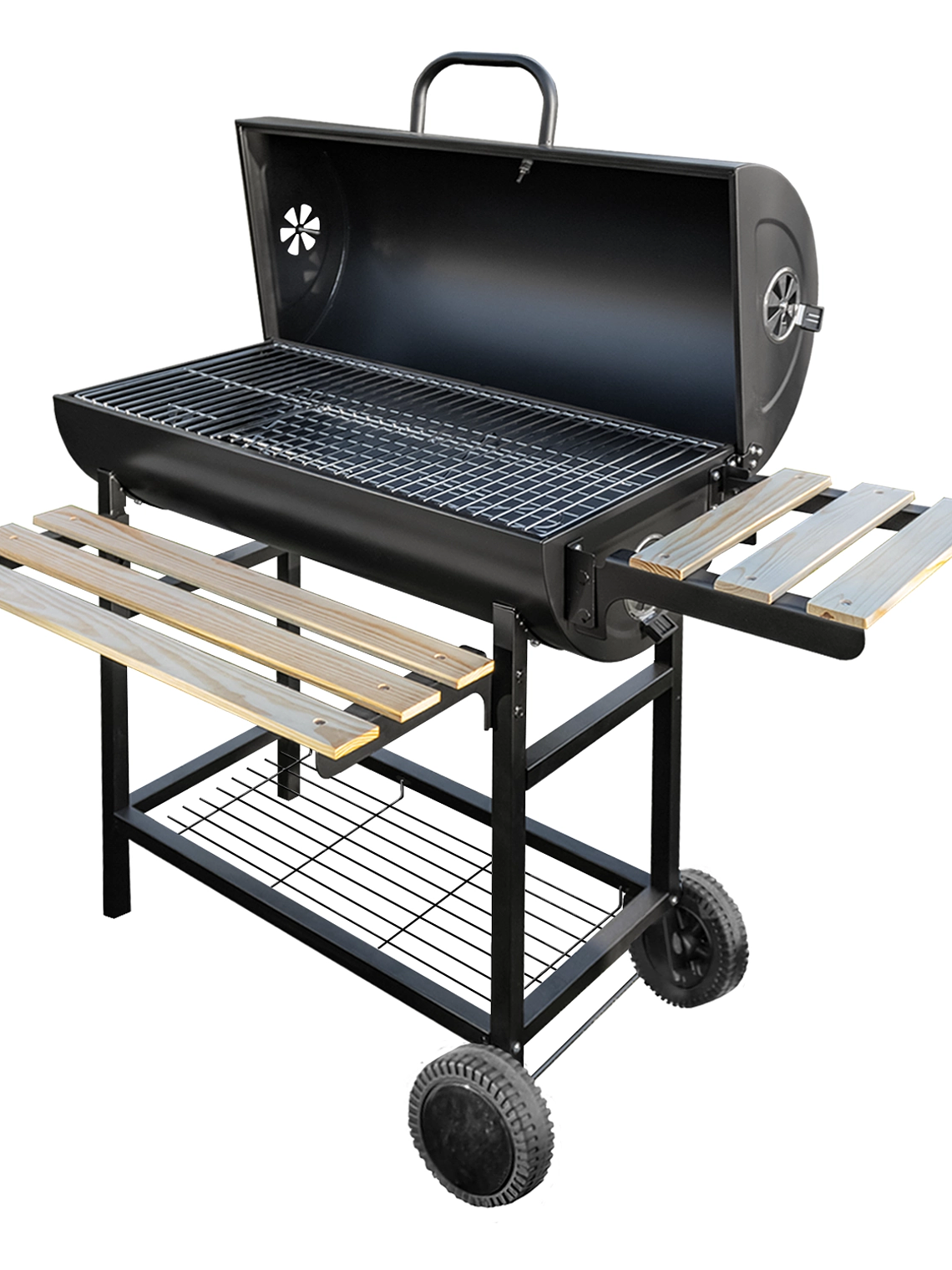 Incluye bandejas plegables frontal y lateral, perfectas para apoyar utensilios o ingredientes, además de una rejilla inferior multipropósito que entrega organización adicional. Su estructura de acero con tapa resistente garantiza durabilidad, mientras que el termómetro incorporado y el regulador de flujo de aire te permiten tener un control preciso del calor durante todo el proceso.